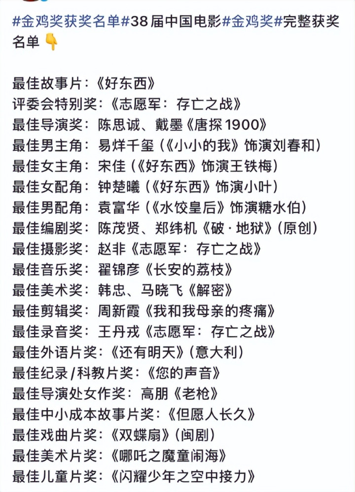 11月15日,金鸡奖的最终获奖名单落下帷幕。