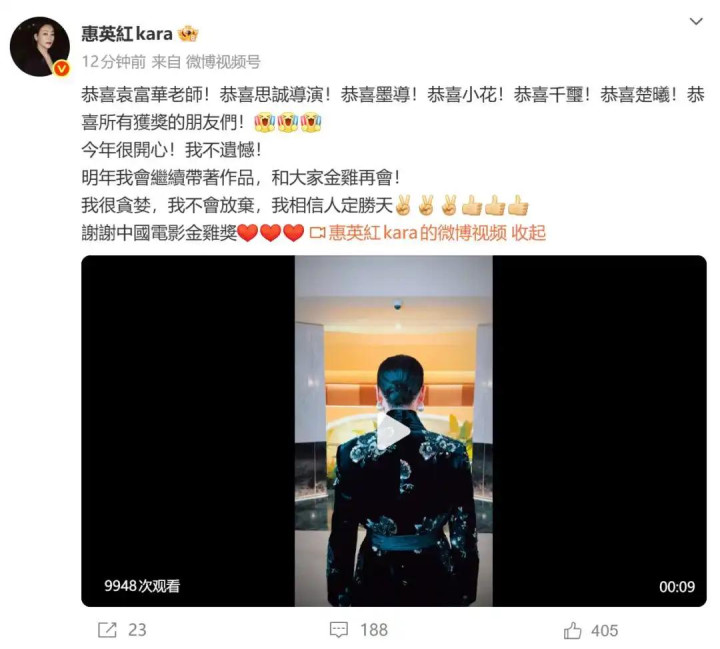 惠英红发文祝贺拿奖的人,并且说自己没遗憾。